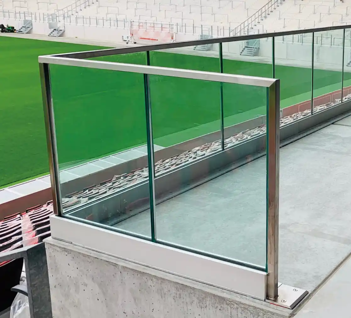 ガラスとガラスの継ぎ目に支柱がなく、景観の邪魔をしない支柱レスフェンスです。革新的な固定方法Q-DISCシステムにより、シーリング材もくさびも必要なくQ-DISCを回すだけで設置でき省施工。