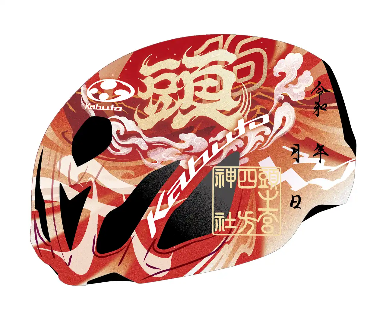 この御朱印は、自転車レースの国際大会で日本代表チームが使用した、トラック競技用ヘルメットのエアロ 性能を受け継ぐオージーケーカブト「AERO-R2」のフォルムを取り入れ、全国初となる自転車ヘルメット型御朱印になっております。 |