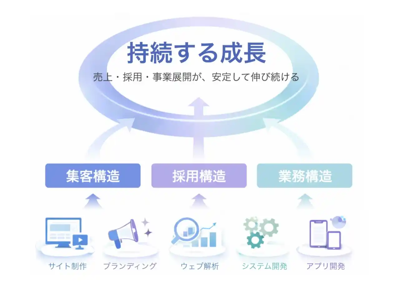 ホームページは単なる看板ではなく、24時間働く「経営基盤」であるべきです。私たちは【集客・採用・業務効率化】を阻む壁をテクノロジーで破壊し、事業成長とデジタルトランスフォーメーション(DX)を加速させる戦略的パートナーとして、企業の未来を共に歩みます。 |