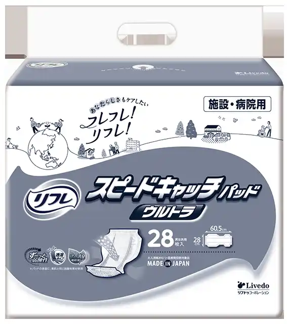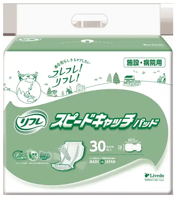 | 「業務用リフレ スピードキャッチパッド」シリーズは、尿をすばやく引き込む瞬間吸収シートを採用し、一気に排尿する方でも安心して使えるとお客様からご好評をいただいております。 | |||||||||||