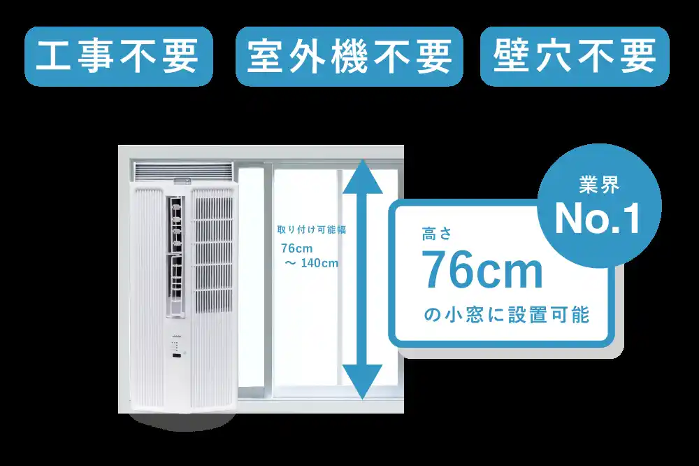 窓用エアコンの最大の特徴は設置の手軽さ。工事不要で窓枠にはめ込むだけで使用することができます。CAZALiシリーズは高さ76cmの小窓でも設置することが可能で最小取付可能幅は業界No.1です。(2026年3月時点) |
