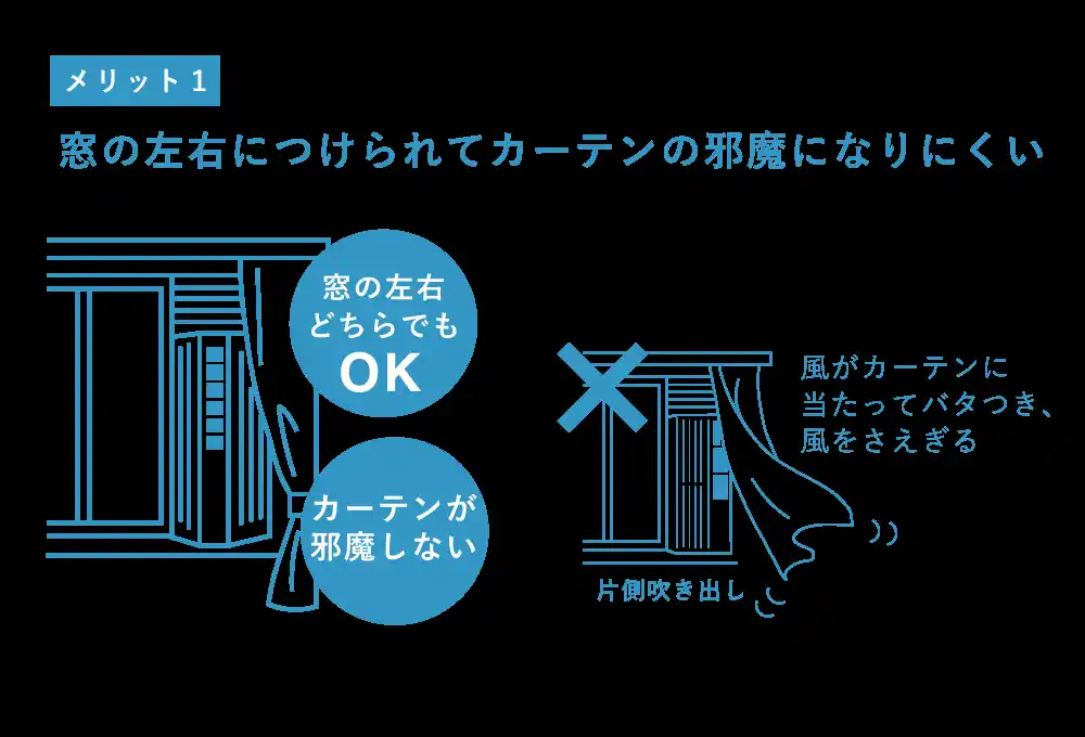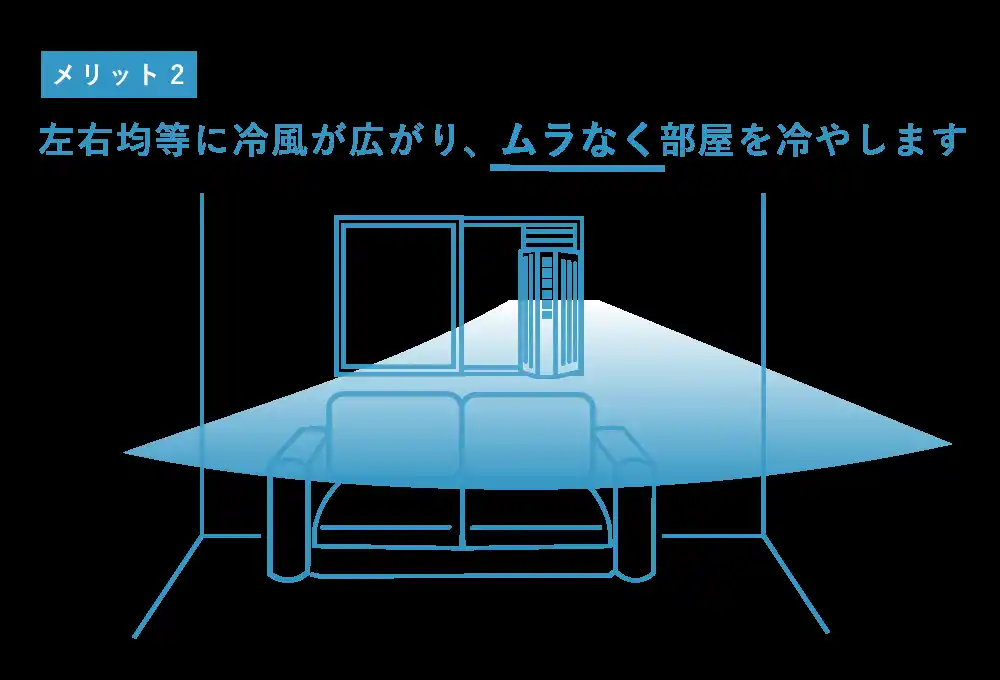 CAZALiシリーズは、吹き出し口を本体中央に配置した 「センター吹き出し」 仕様。 従来の片側吹き出しタイプでは、冷風がカーテンに当たってバタつきや風遮りが起こりがちでしたが、センター吹き出しならカーテンに干渉せずスムーズに風を届けます。さらに、左右どちらの窓枠にも取り付けられるため、設置場所を選ばずレイアウトの自由度が高まります。さらにセンター吹き出しは、本体中央から風を送り出すため左右へ均等に広がり、室内の空気をムラなく循環させます。 |