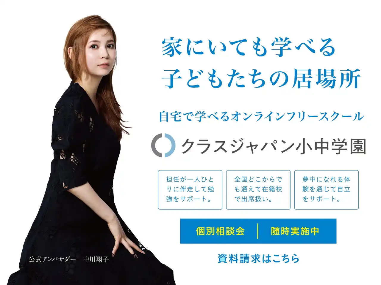 | クラスジャパンは2018年に開校したオンラインフリースクールです。生徒一人ひとりに担任が伴走し、子どもが自分のペースで勉強ができるようサポート。勉強以外にもeスポーツ、プログラミング、イラストなど、得意を伸ばす部活動もある不登校生徒の新しい居場所です。 これまでに1500人以上の子どもたちをサポートしてきました。 将来の進路選択の際に不登校が不利益になることのないよう、社会的自立や参加を実現するための環境作りに取り組んでいます。 | |||