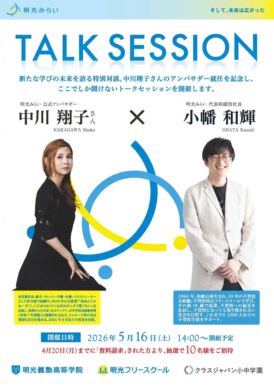 2026年4月12日14時からオンラインイベントを開催します。 ※こちらのイベントには中川翔子さんの登壇はありません。ご注意ください。 当事者の方、明光みらいに興味のある方など幅広くご参加いただければ幸いです。 |