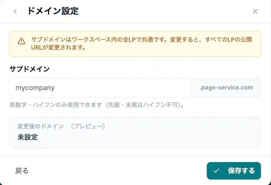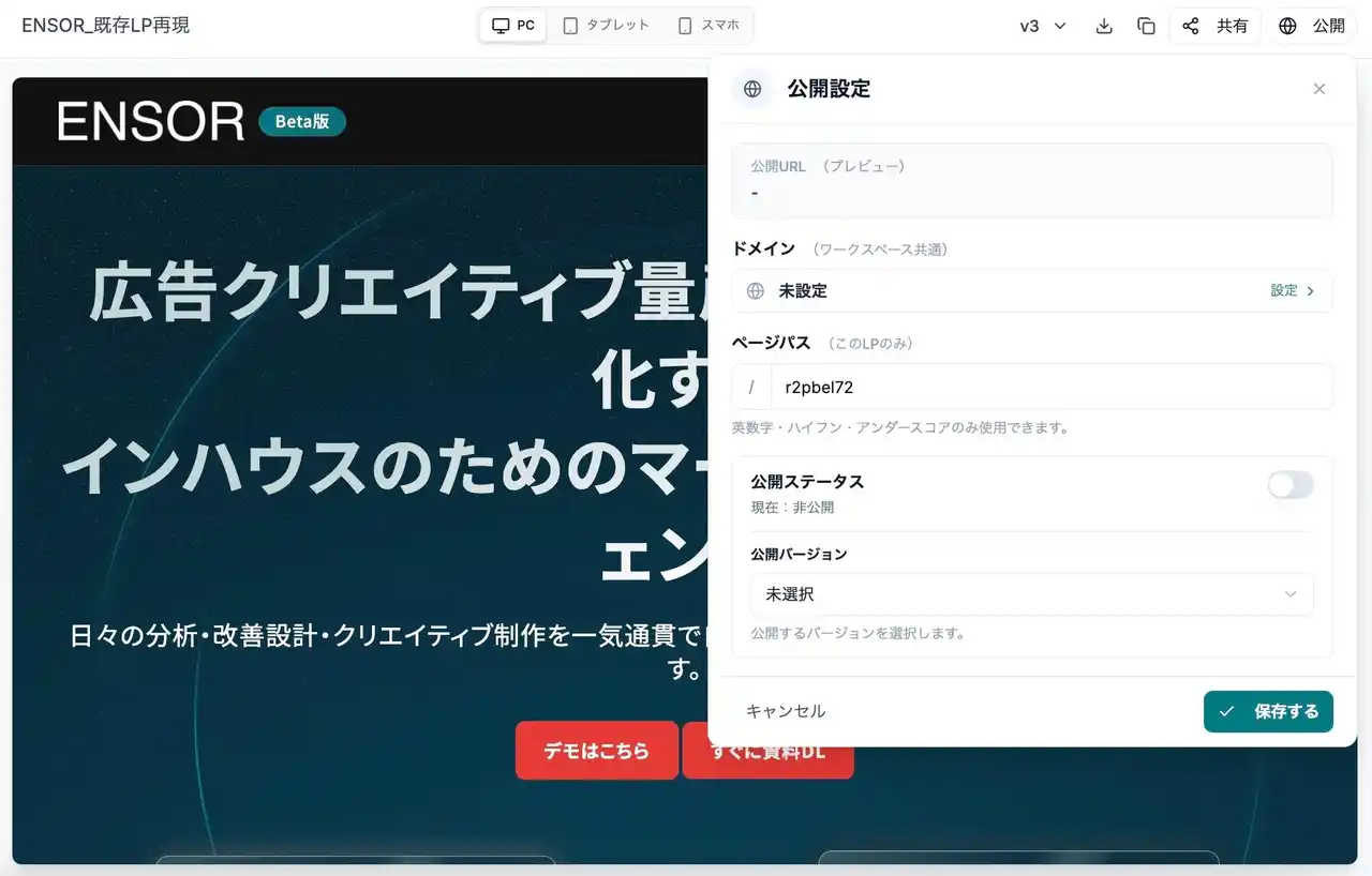 (2)LPデプロイ(公開) ページ作成時に公開オプションが利用でき、固定ドメイン部分として page-service.com を用いたURL設計が可能です。ワークスペース共通のサブドメインと、ページ固有のパスを組み合わせて公開URLを構成できます。公開ステータスに加え、**公開バージョン**を選択できる仕様とし、編集内容を本番の公開に反映するには*公開バージョンの更新*が必要となる運用で、下書きと外向きの版の整理をしやすくします。 ▼ Before 既存LPの改修は別ツールや手作業が中心になり、公開URLの管理や版の切り分けがバラバラになりやすい。 ▼ After URLから取り込んで即編集し、所定ドメイン上でサブドメイン・パス・公開バージョンを管理しながらデプロイまで完結できる。 |