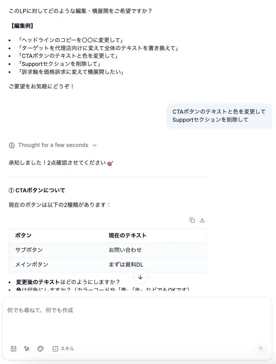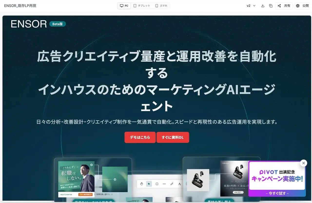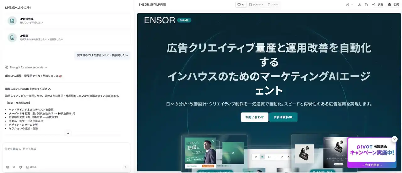 (1)LPのURL取り込み再現 ENSORのLP制作チャットに、既存LPのURLを入力すると、ページ構成を取り込み、画面上でレイアウトを再現します。再現した状態から、ファーストビューの変更や要素の修正などを対話ベースで進められ、制作の立ち上がりを短縮します。 |