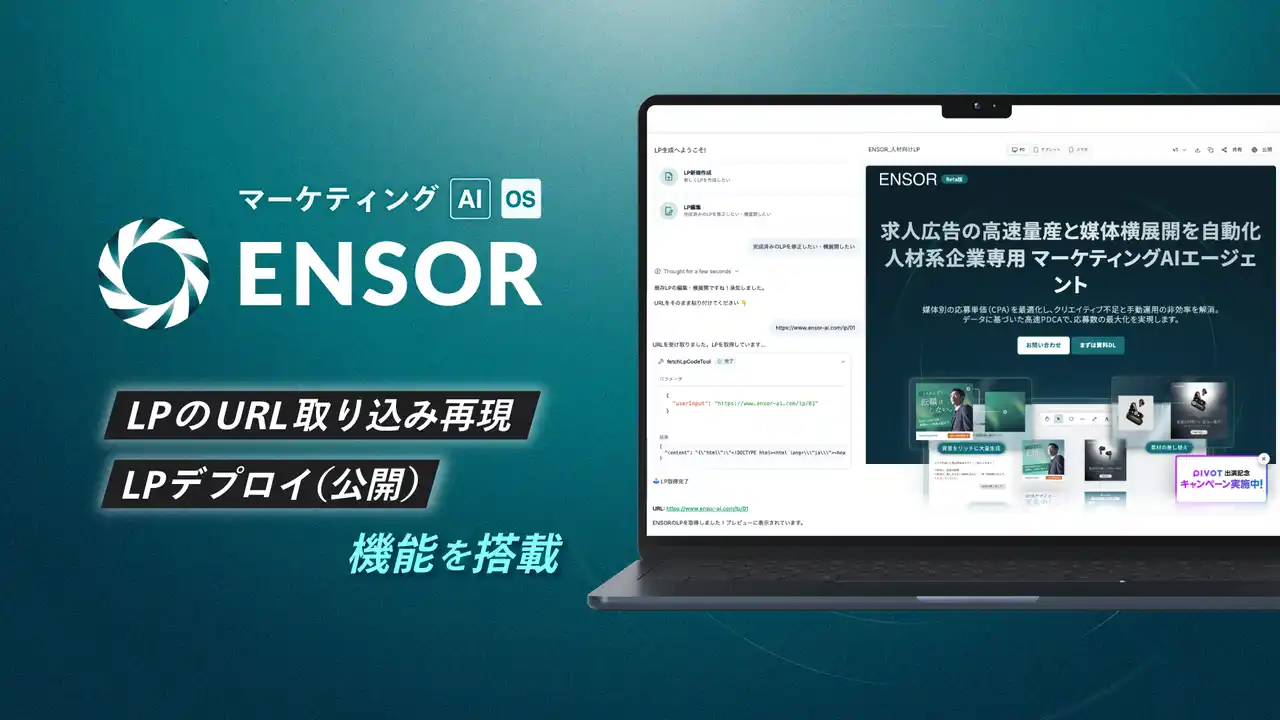 | ENSORは、LP制作チャットへのURL入力による取り込み再現と、所定ドメインでのデプロイ(公開)を組み合わせることで、取り込みから編集、公開版の更新までを同一プロダクト上で行える環境を整えます。 | ||||||||||||||||||||||||
