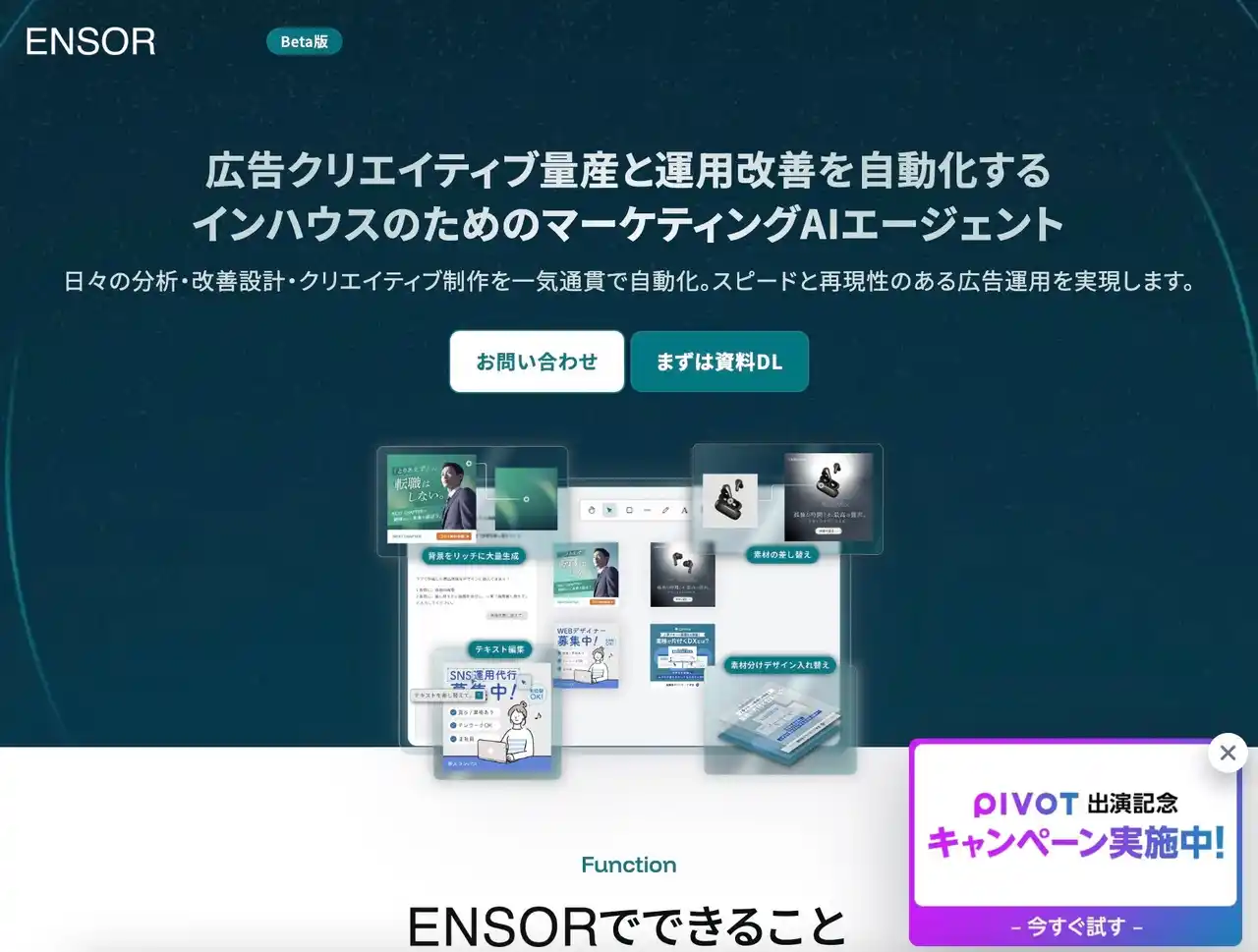 ENSORは、「勝ちバナーを量産するAI──学び続けるマーケティングOS」をコンセプトとした、マーケター向けAIクリエイティブ生成プラットフォームです。クリエイティブの施策立案から連携・生成までを、従来の1/5の時間で実行します。広告・CRM・SFA・ECなどに散在するデータを統合し、AIがリアルタイムで分析・施策提案を実行するマーケティングAI OSとして、データ分析・クリエイティブ生成業務の工数削減を実現しています。 【主な機能】 |