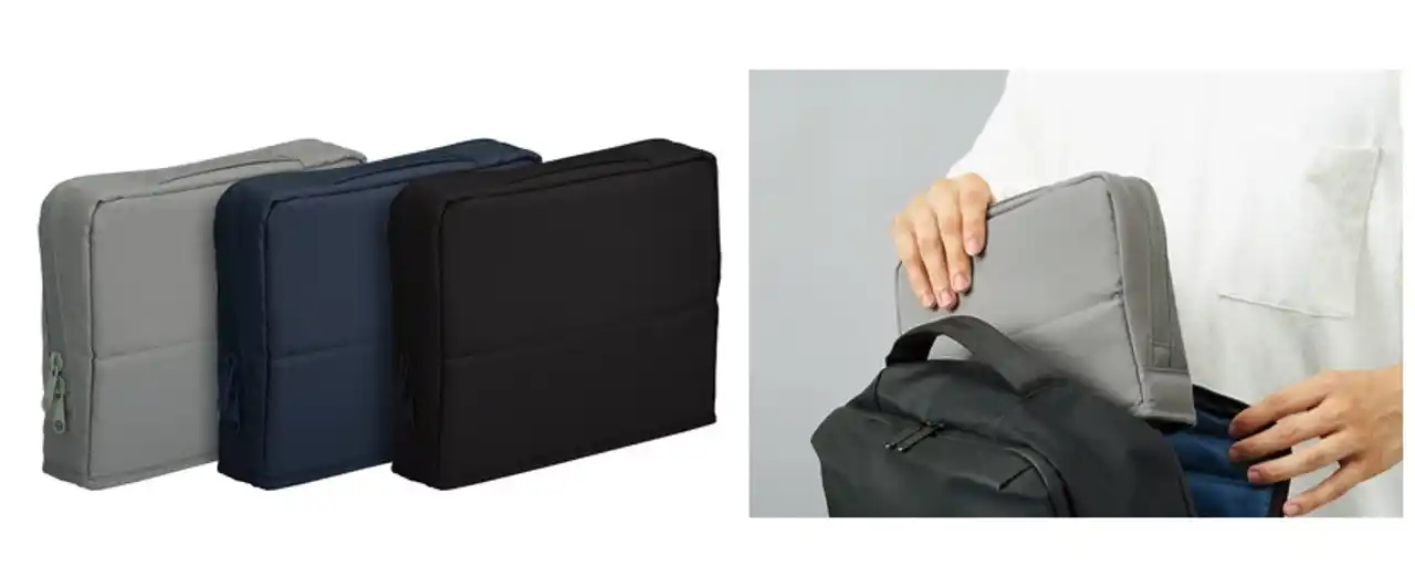 外側には落ち着いた風合いのポリエステル生地を採用しており、ビジネスシーンからカジュアルなシーンまで幅広く使いやすいデザインです。四角い薄型形状でバッグやロッカーへの収まりも良く、社内移動はもちろん、外出先へもスマートに持ち運ぶことができます。 |