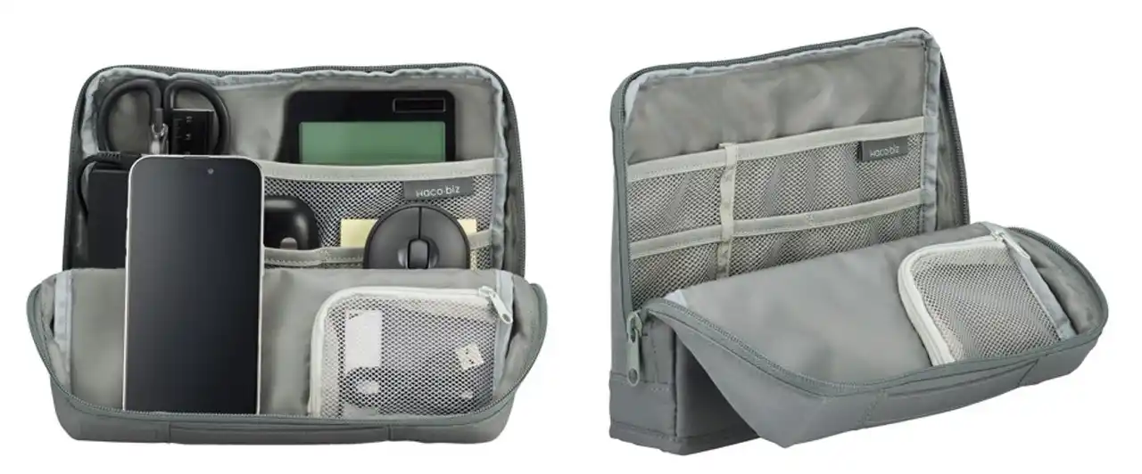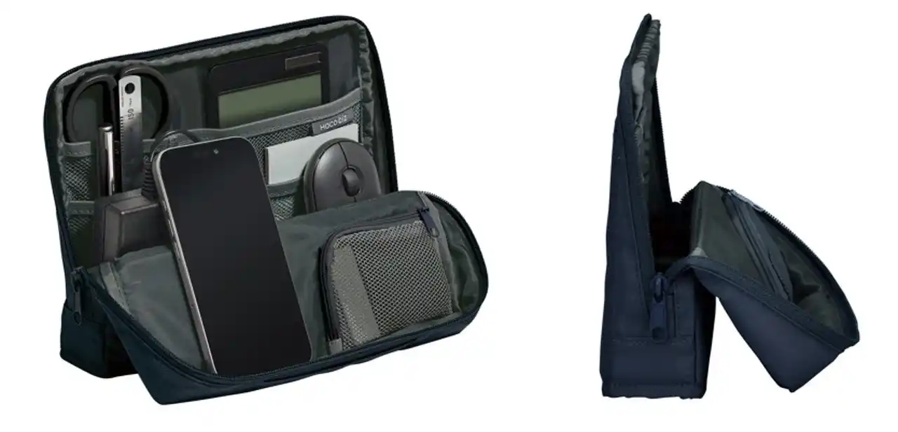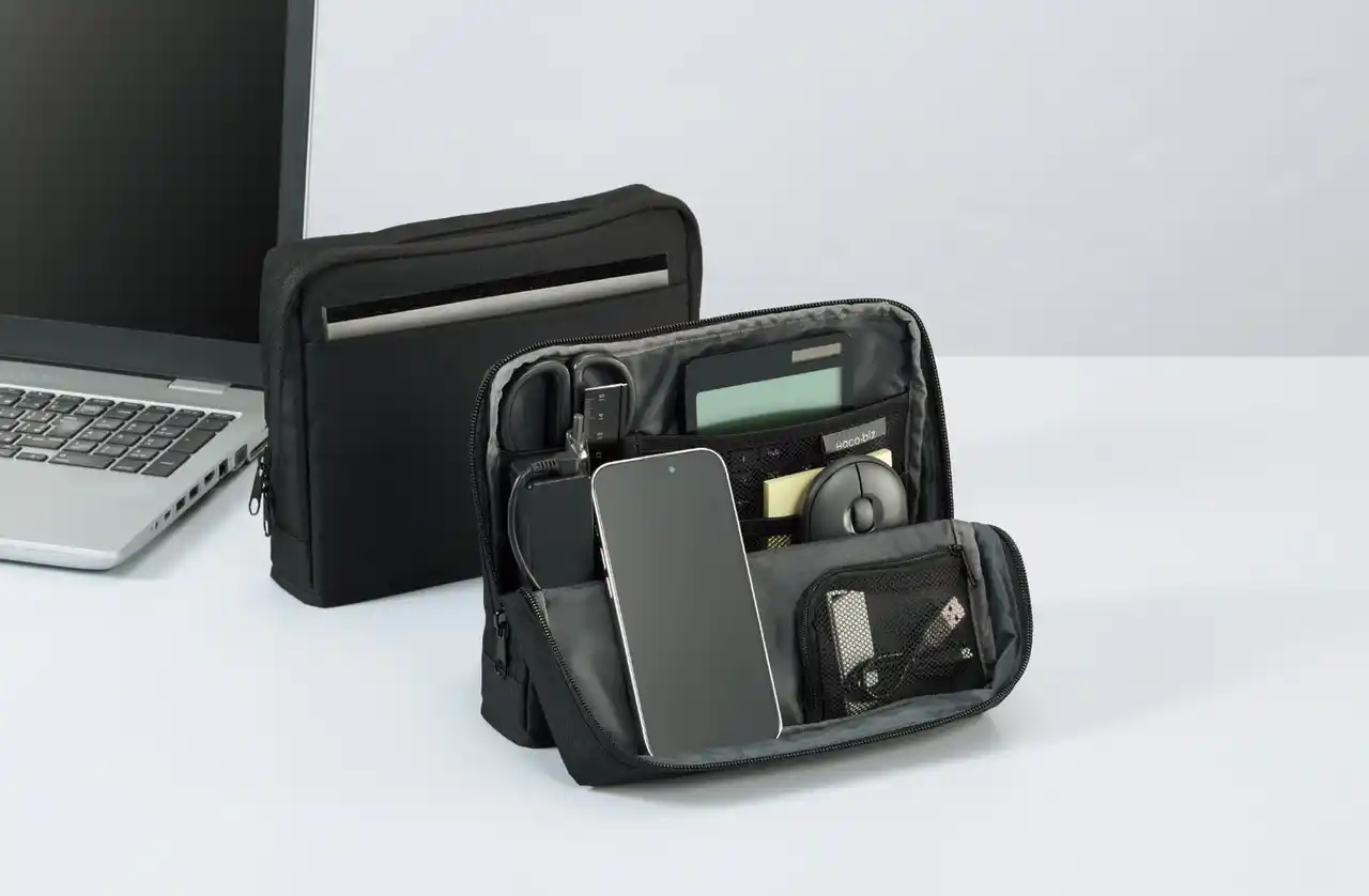 マウスやACアダプターなどの大きめのガジェット類を収容できるスペースと、ペンやイヤホンなどの文具や小物類を整理しやすい6つのポケットや仕切りを備えているため、より収容力がアップしました、また、ファスナーを開けるだけで開口部が前方に広がって自立する構造のため、必要なものをスピーディーに取り出すことができます。フリーアドレス環境で働くオフィスワーカーの仕事効率の向上をサポートします。 |