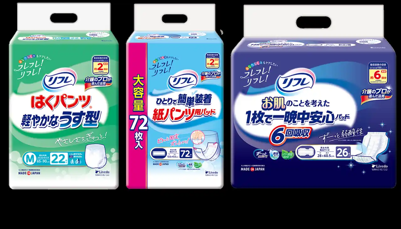 | 「リフレ」は、介護・ケアを受ける方や介護に携わる皆さまに寄り添い、日々の安心と尊厳を支えるブランドとしての姿勢を、これからもデザインを通じて伝えていきます。 | |||||||||