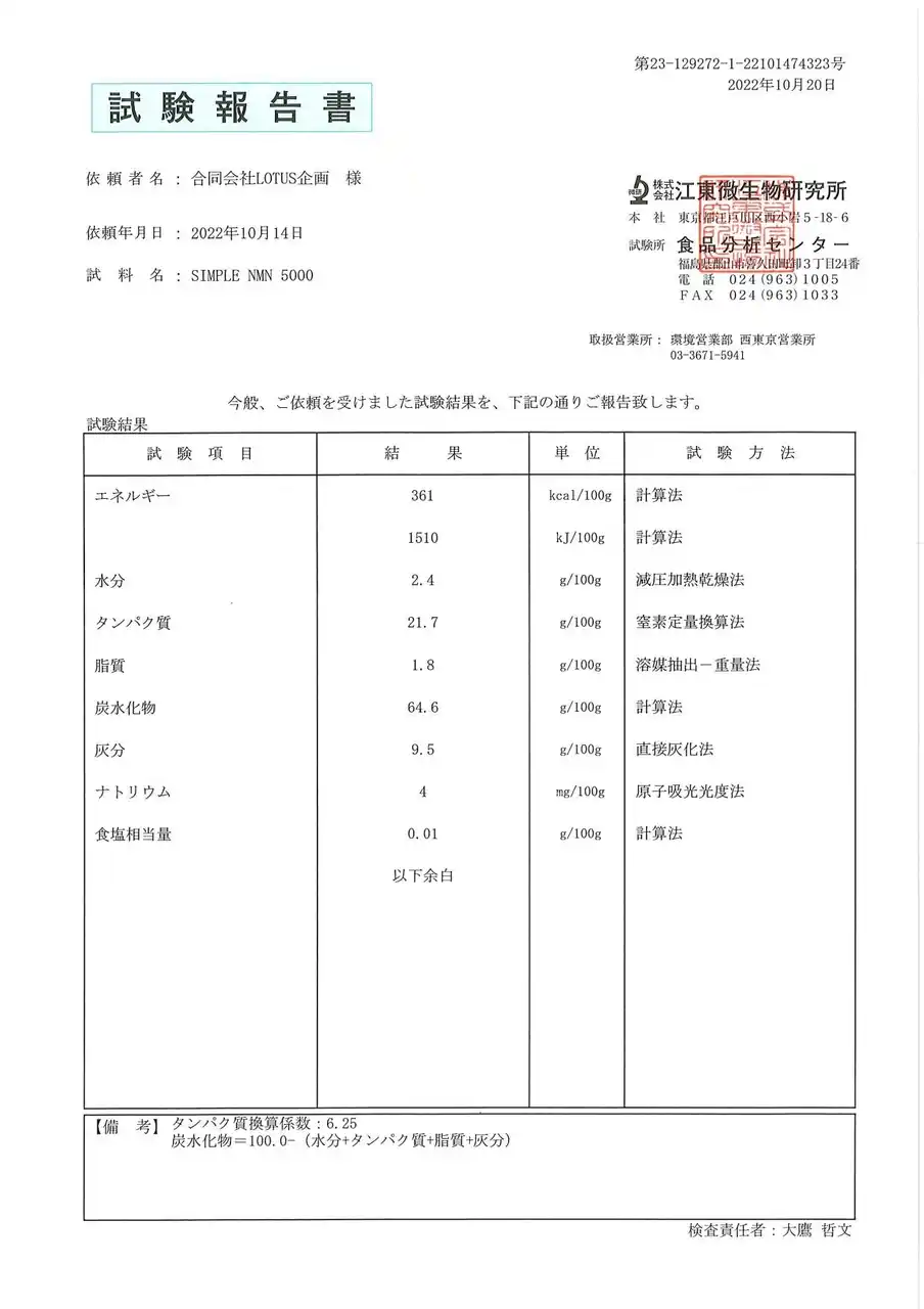 | 厚生労働省の認定機関によるNMNの成分分析の結果です。 | |||