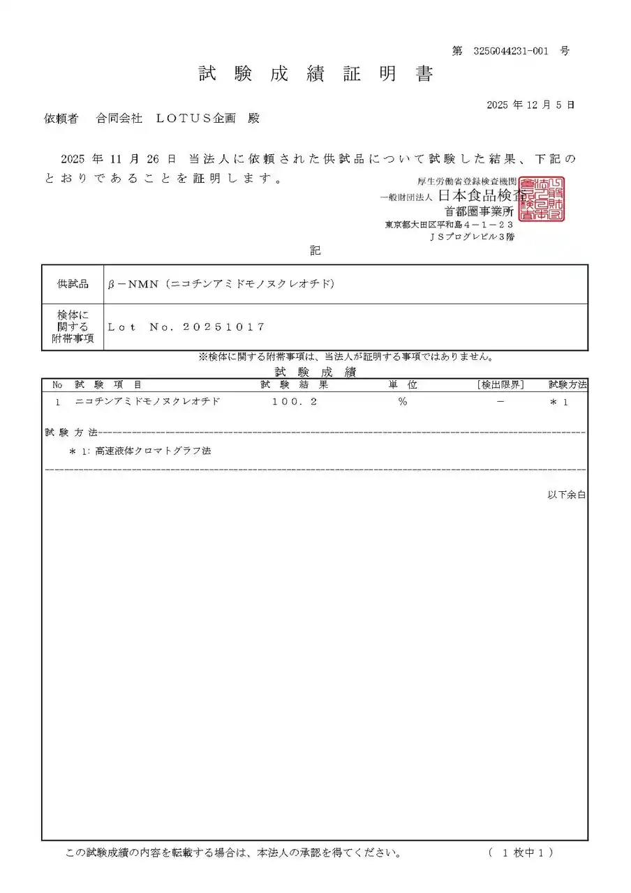 厚生労働省の認定機関によるNMNの純度試験の結果です。