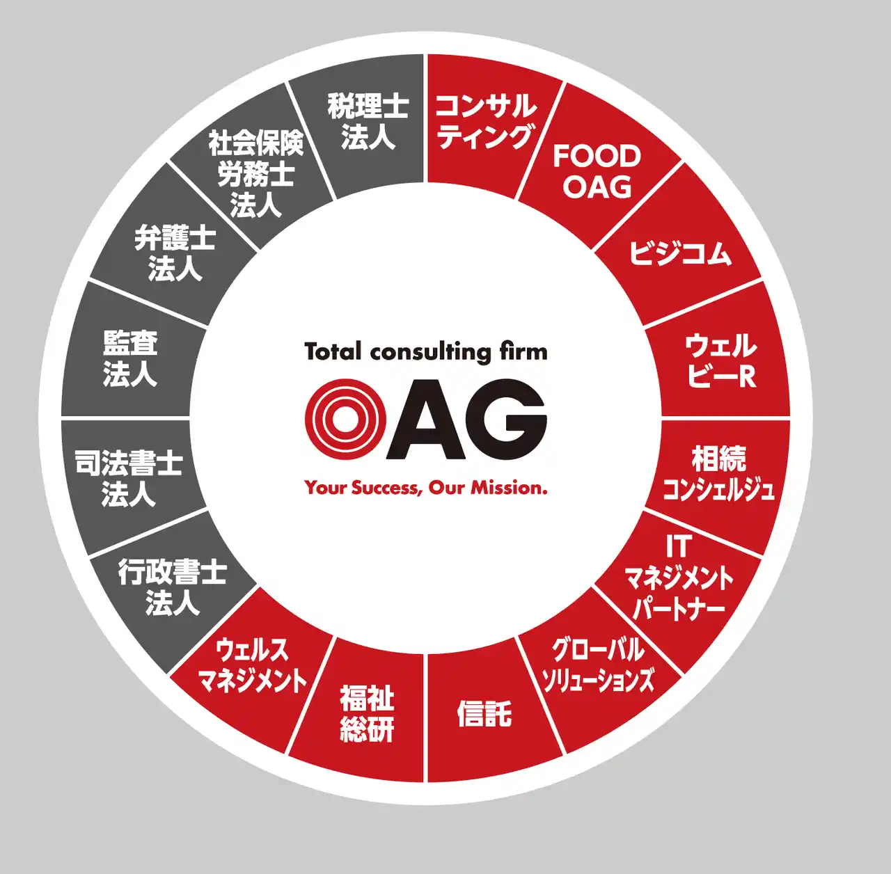 OAGグループは、6つの士業法人と10の株式会社を擁する総合コンサルティングファームです。「お客様の最良のパートナー」として、複雑な経営課題や財産問題に対して、専門性の高いプロフェッショナルが連携し、最適なソリューションを提供しています。 |
