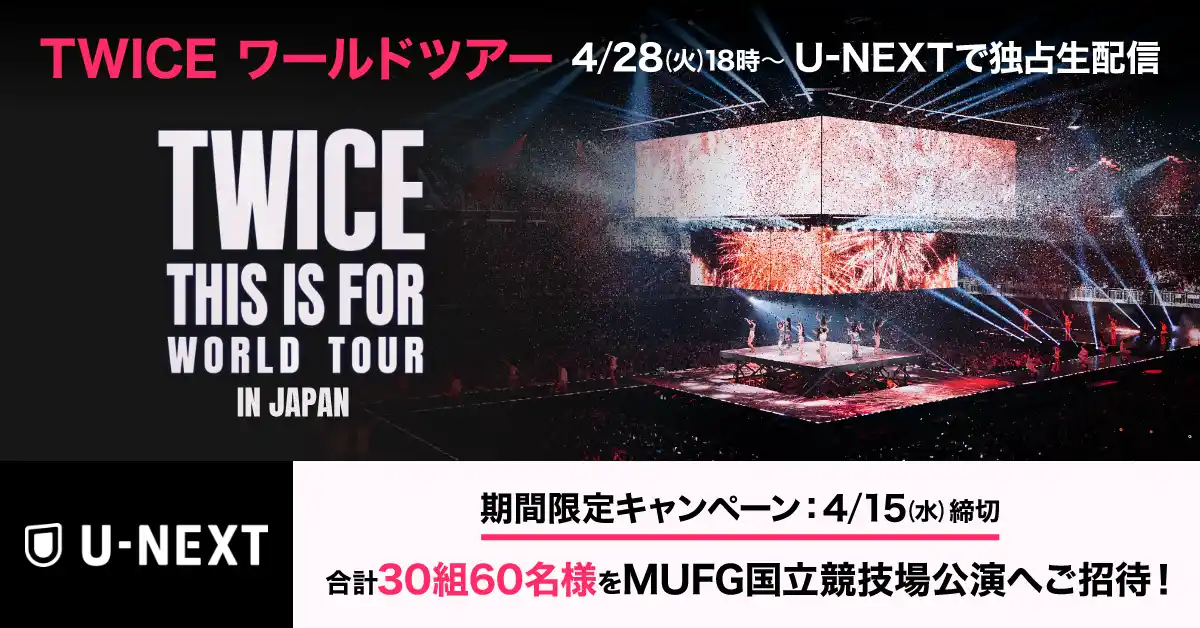 USEN&U-NEXT GROUPの株式会社U-NEXT(本社:東京都品川区、代表取締役社長:堤 天心)が運営する動画配信サービス「U-NEXT」は、4月28日(火)にMUFG STADIUM(国立競技場)にて開催される「TWICE <THIS IS FOR> WORLD TOUR IN JAPAN」の模様を独占生配信いたします。これを記念して、会場チケットのプレゼントキャンペーンを本日より開始いたします。 |