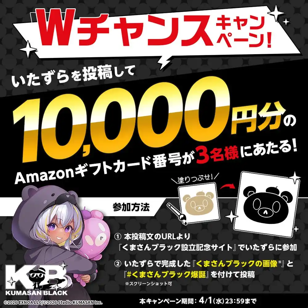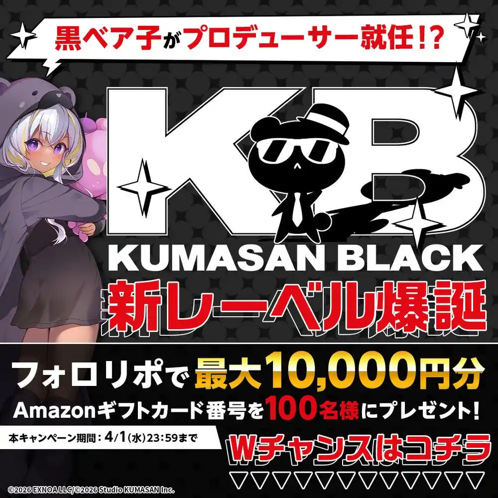 黒ベア子が新レーベル「くまさんブラック」プロデューサー就任を記念して最大10,000円分のAmazonギフトカード番号が当たるフォロー&リポストキャンペーンをXにて開催中です。 |