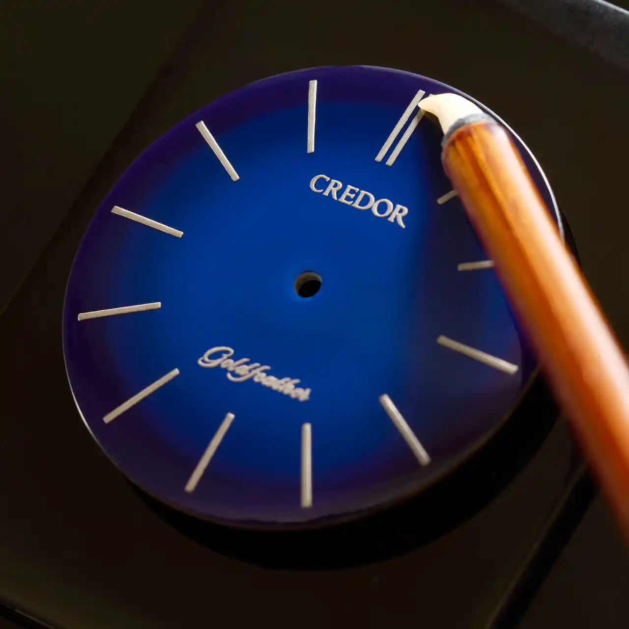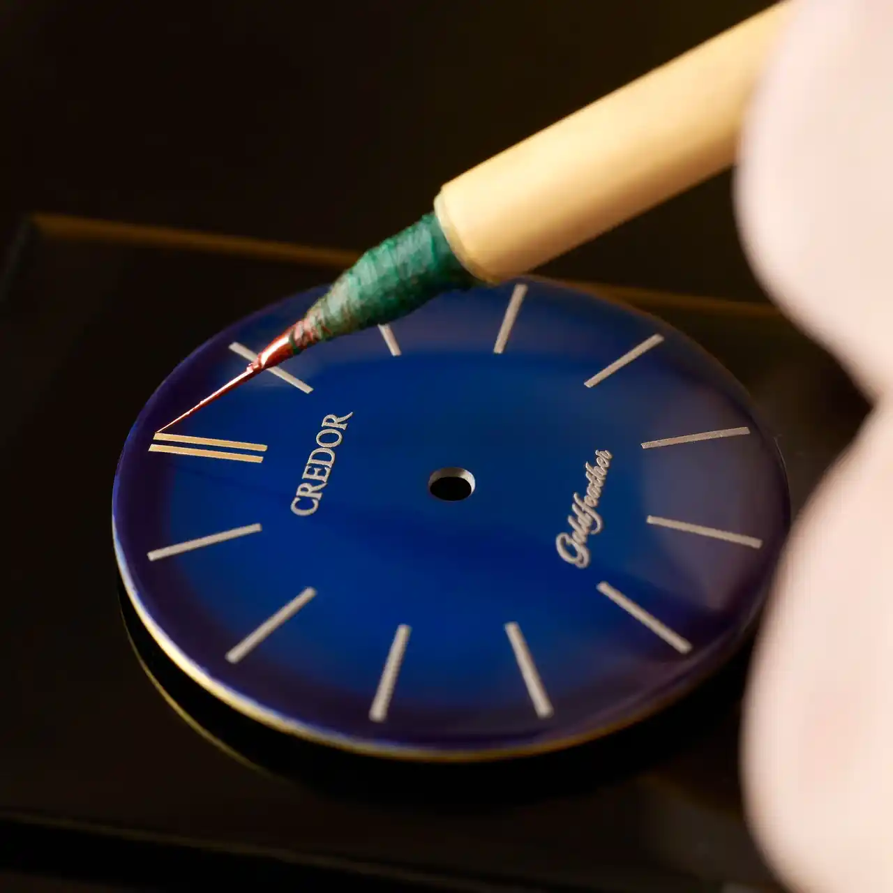 さらに、12か所のインデックスや「CREDOR」ロゴ、6時位置の「Goldfeather」は、全て高蒔絵(※1)で描いています。繊細かつ立体的な高蒔絵が生み出す陰影は、ダイヤルに奥行きと豊かな表情をもたらします。 |