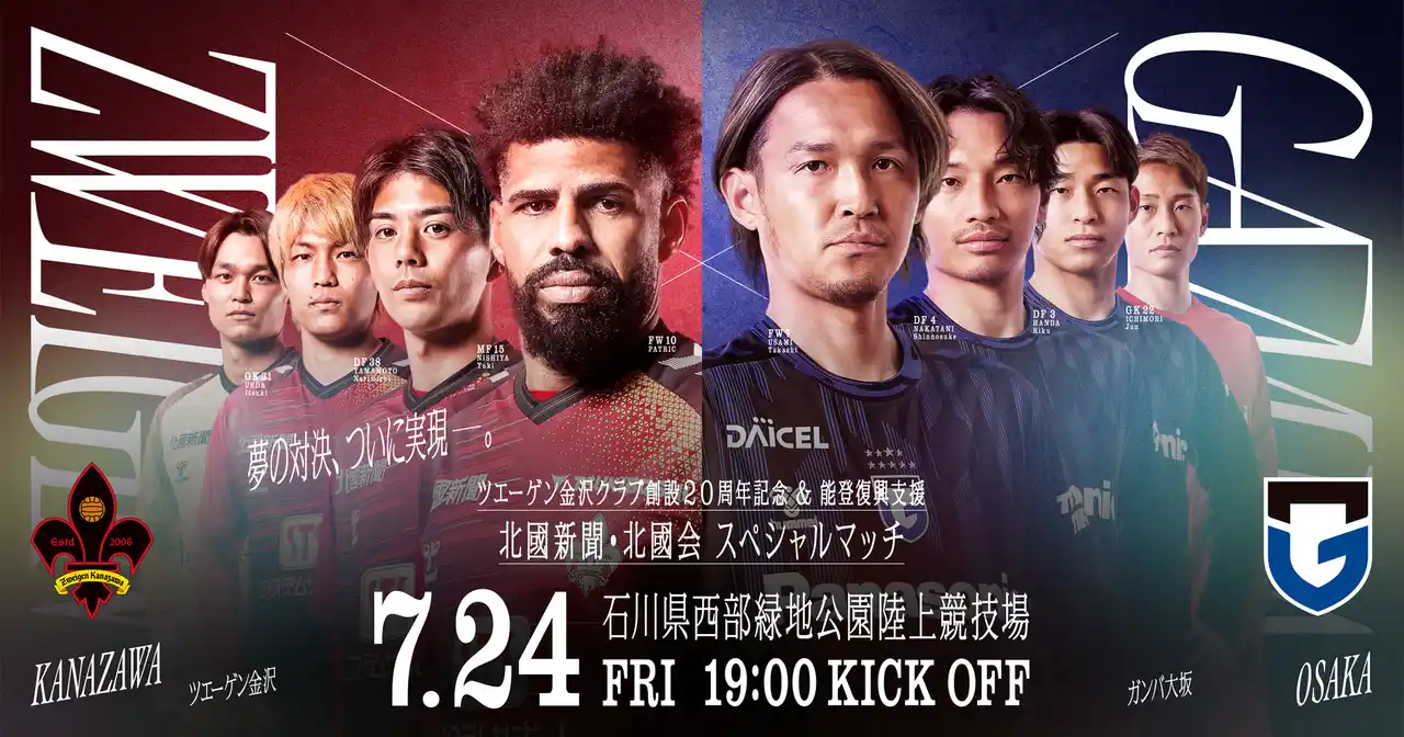 ツエーゲン金沢では、クラブ創設20周年の記念事業の一環として、また能登地域の復興支援の発信および機運醸成を目的に、ガンバ大阪を迎えての記念試合を開催することが決定いたしました。