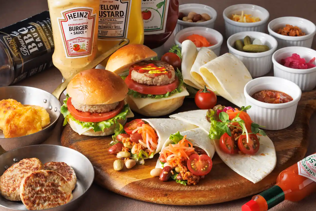 | バンズ(ロールパン)/トルティーヤ/チキンナゲット/ミニハンバーグ/フィッシュフライ/たまごサラダ/フリルレタス/スライストマト/オニオンリングフライ/スイートレリッシュ/ミックスチーズ/ソース(ケチャップ・バーガーソース・イエローマスタード・BBQソース) | ||||||||||||||