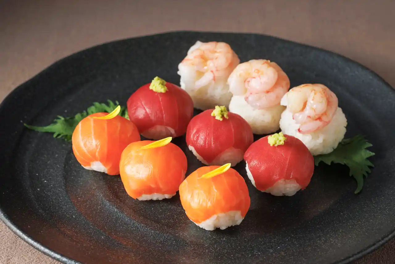 | 鮪・サーモン・甘海老の手まり寿司もお好きなだけ。一口サイズで小さなお子さまから大人までお楽しみいただけます。 | ||||||||||||||
