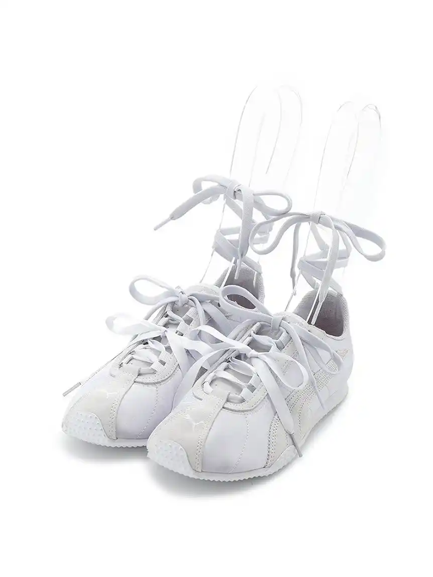 シューレースはヒールのループに通して足首に巻き付けたり、ショートタイプに付け替えてリボンが二つ並ぶように結んだりと、キュートなアレンジが可能。 |