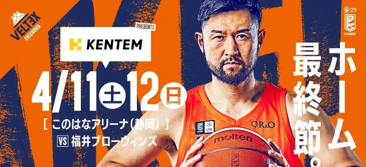 KENTEM(株式会社建設システム)は、4月11日(土)・12日(日)に開催されるベルテックス静岡の りそなグループ B.LEAGUE 2025-26シーズン ホーム最終戦を、KENTEMプレゼンツゲームとして実施いたします。 シーズンを通して数々の熱戦を繰り広げてきたベルテックス静岡にとって、本試合はホームで戦う今季最後の2連戦。これまでチームを支えてくださったブースターの皆さまとともに、シーズンの集大成を迎える大切な試合となります。 |