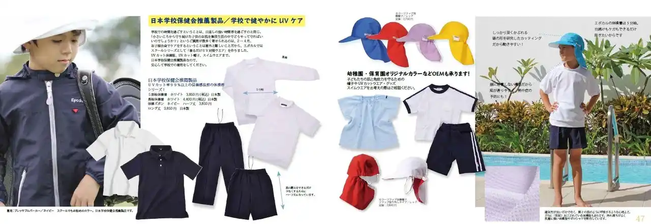 | エポカルブランドが最初に向き合ったのは、幼稚園・保育園での集団生活における紫外線対策でした。外遊びの多い幼児期こそ、肌へのダメージが蓄積しやすい時期です。園や先生方と連携しながら、UVカット通園帽子、UVカットフラップ体操帽子(たれ付き)、UVカット体操服・制服を開発・提供し、子どもたちの健やかな成長を見守り続けてきました。全国約100の園への導入、公益財団法人日本学校保健会の推薦品認定は、その積み重ねの証です。 | |||||||||