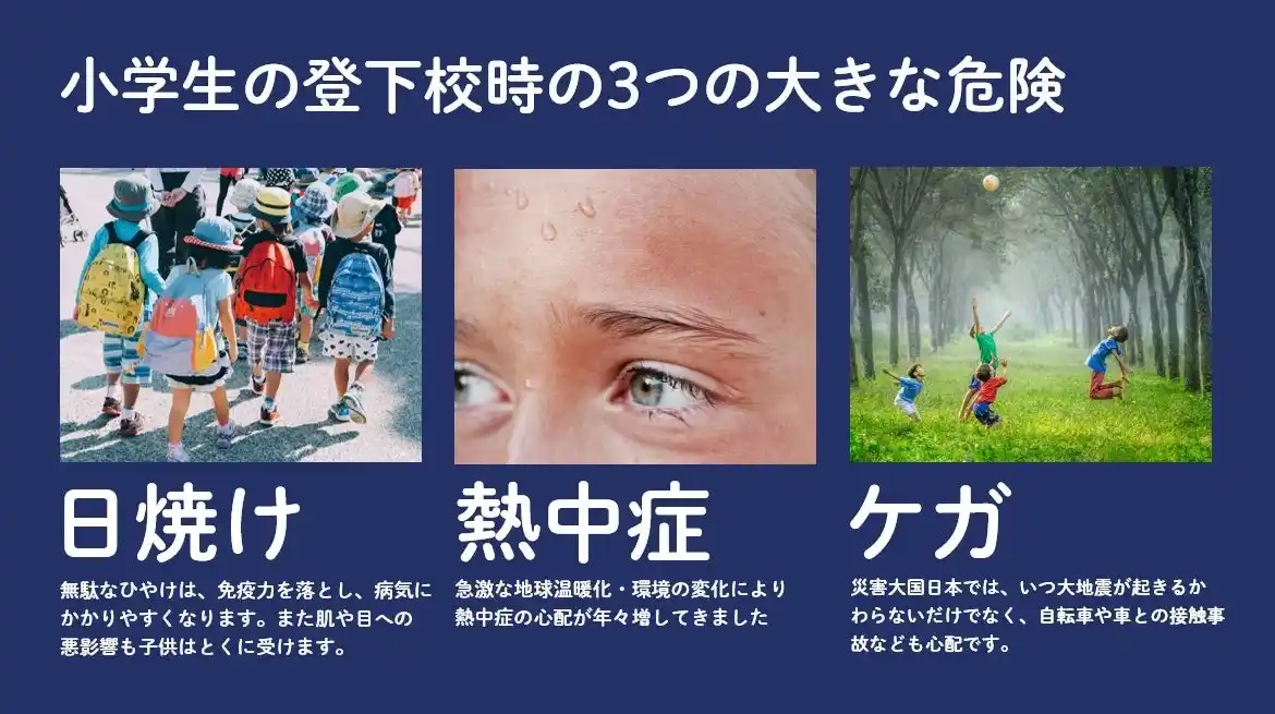 | 紫外線・熱・衝撃という三重のリスクを、たった1つの帽子で解決する--「かぶっているだけで守られる」通学帽子を作ることが、私たちの使命です。 | |||||||||