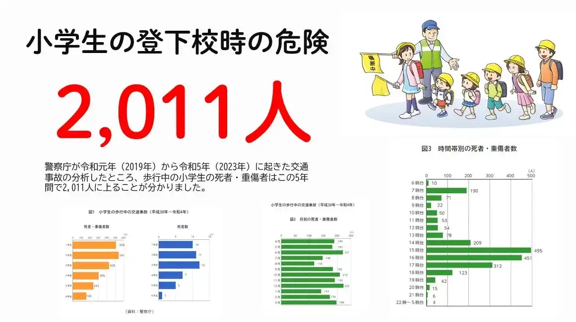 | 年間500人もの児童が大きなけがをしたり亡くなったりするというデータが警察庁からの発表にありました。小さなけがを入れるとその10倍以上の子供たちが通学中にケガをします。 | |||||||||