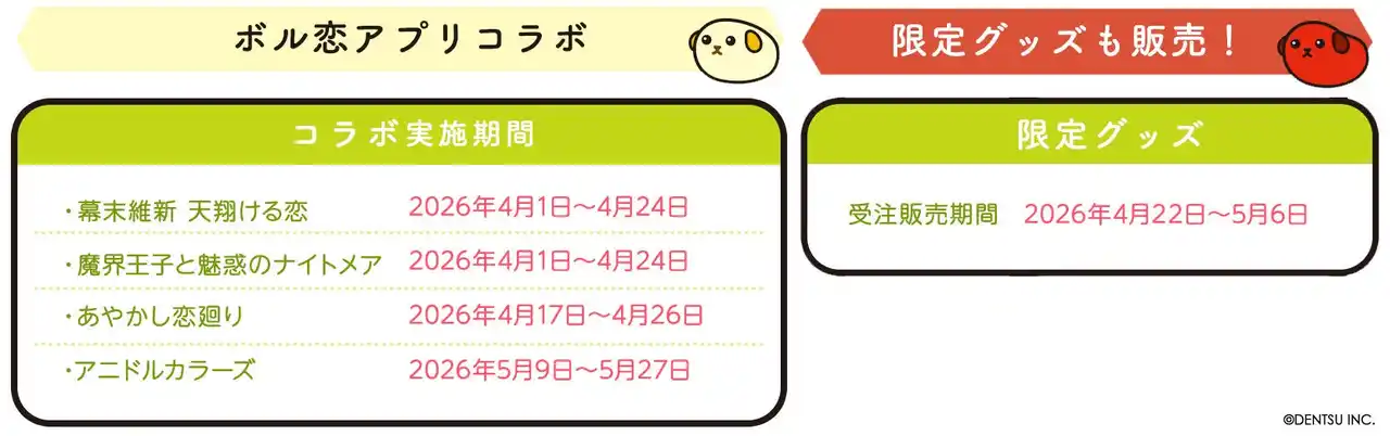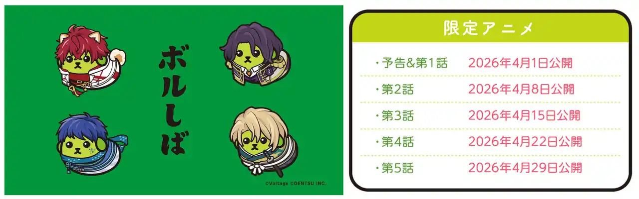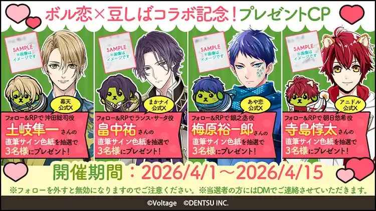 株式会社ボルテージ(本社:東京都渋谷区 代表取締役:津谷 祐司)は、提供中のボル恋アプリ4作品において、人気キャラクター「豆しば」とのコラボレーション企画を、2026年4月1日(水)より順次実施いたします。