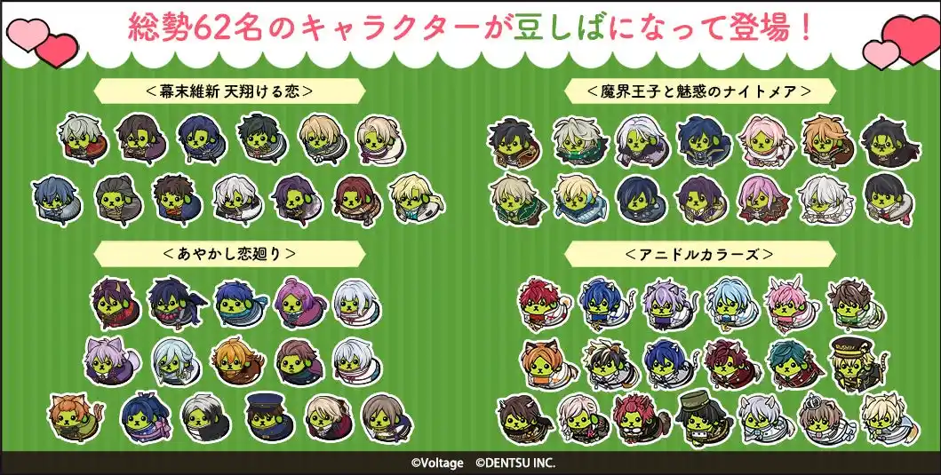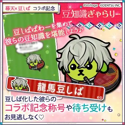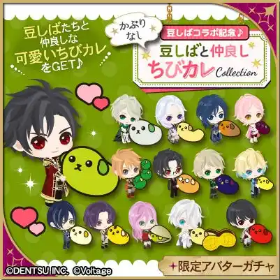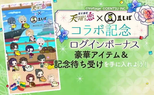 本コラボレーションには、「幕末維新 天翔ける恋」 「魔界王子と魅惑のナイトメア」 「あやかし恋廻り」「アニドルカラーズ」の4作品が参加いたします。「ねぇ知ってる?」のフレーズでおなじみの「豆しば」とのコラボレーションにより、作品の垣根を越えた企画として、総勢62名のキャラクターが“豆しば”となって登場。豪華声優陣によるコラボレーション限定アニメの公開やオリジナルグッズの販売に加え、アプリ内ではコラボレーション記念ストーリーの配信や限定アバターが手に入るガチャなど、多彩な施策を予定しております。 |