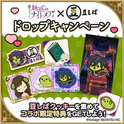 アプリをプレイして手に入る「豆しばクッキー」を集めて、コラボ限定のストーリーやアバター、ナイトメアカード、エンブレムと交換しよう! |
