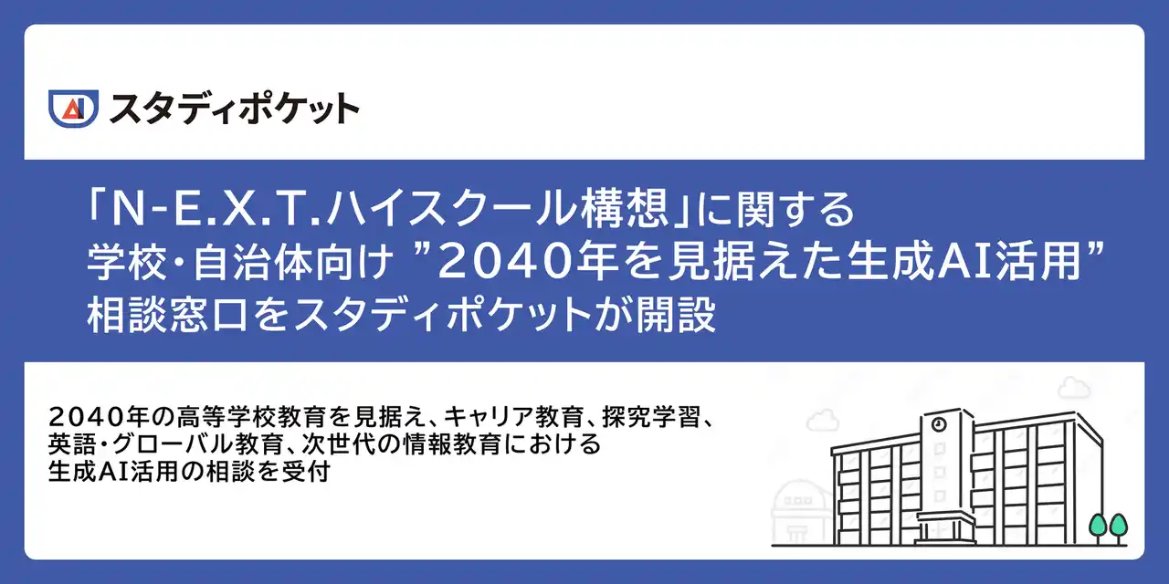| スタディポケット株式会社(本社:東京都千代田区、代表取締役:山地瞭/鶴田浩之、以下「スタディポケット」)は、文部科学省が掲げる高校教育改革「N-E.X.T.ハイスクール構想」(産業イノベーション人材育成等に資する高等学校等教育改革促進事業)に関する、学校・自治体向けの生成AI活用の相談窓口を開設いたしました。 | |||||||||||||||