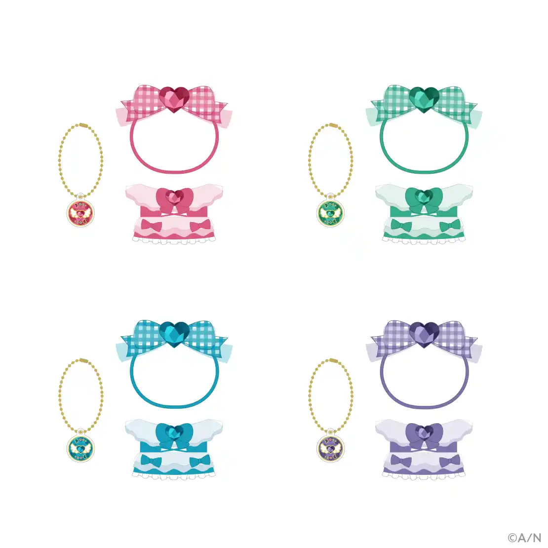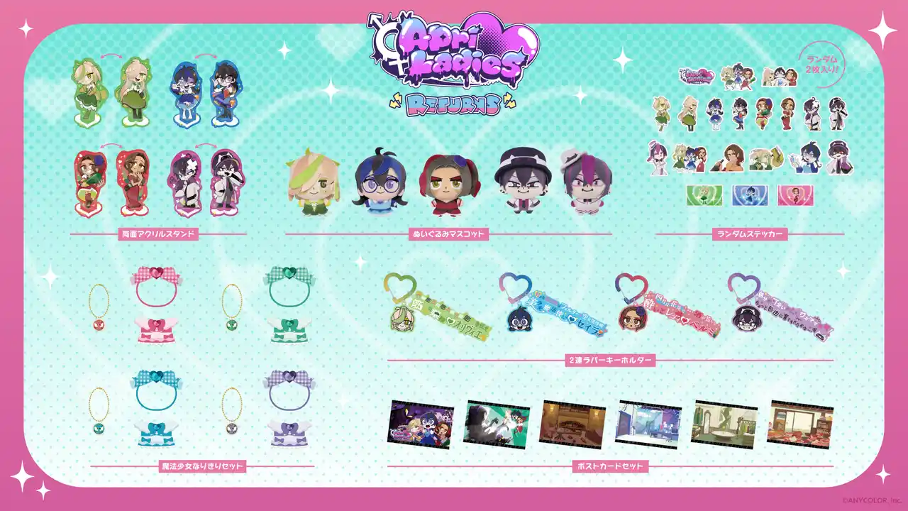 グッズラインナップは、ランダムステッカー、2連ラバーキーホルダー、両面アクリルスタンド、ポストカードセット、ぬいぐるみマスコット、魔法少女なりきりセットの6種類。 |