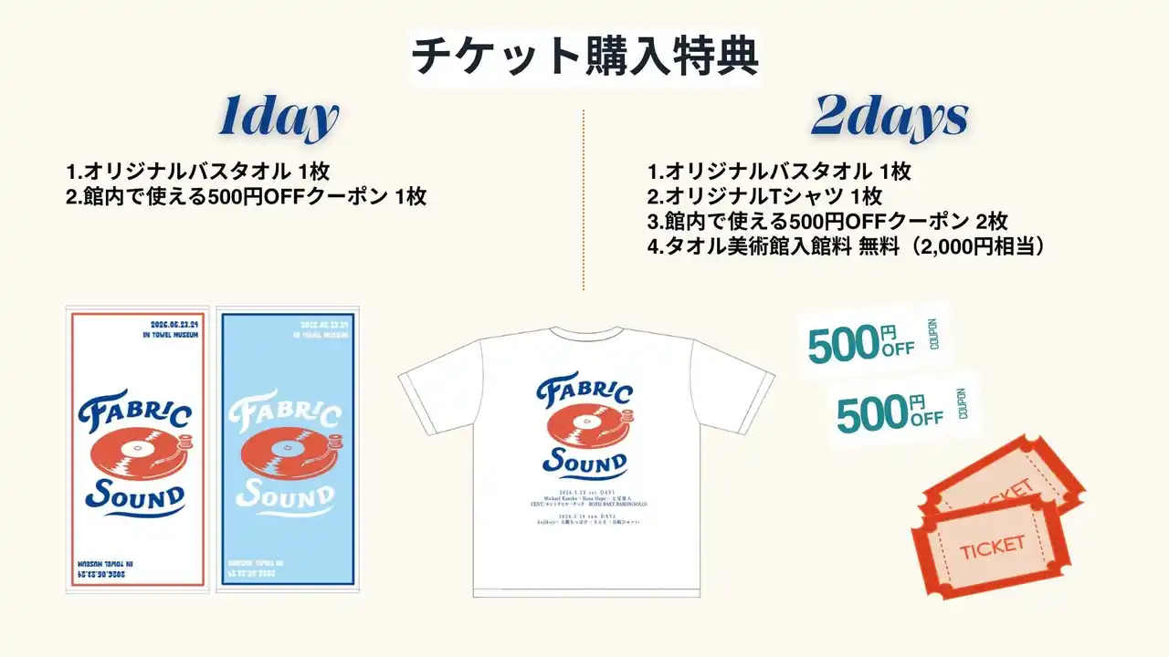 ・FABRIC SOUND ロゴプリント オリジナルバスタオル(ランダム) サイズ:60×120cm/綿100%/日本製 ・オリジナルTシャツ 1枚 ・タオル美術館全館で使える500円OFFクーポン 2枚(2日間有効) ・タオル美術館 入館料無料(2,000円相当) |