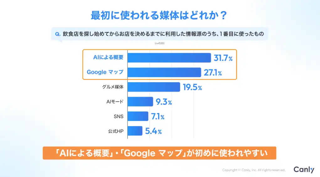 | 最新の調査で「飲食店を探し始めてからお店を決めるまでに、1番目に使った情報源」を伺ったところ、従来の検索方法に加えて、新たなAI検索機能が上位に食い込んでいるという結果が出ました。 | |||||||||