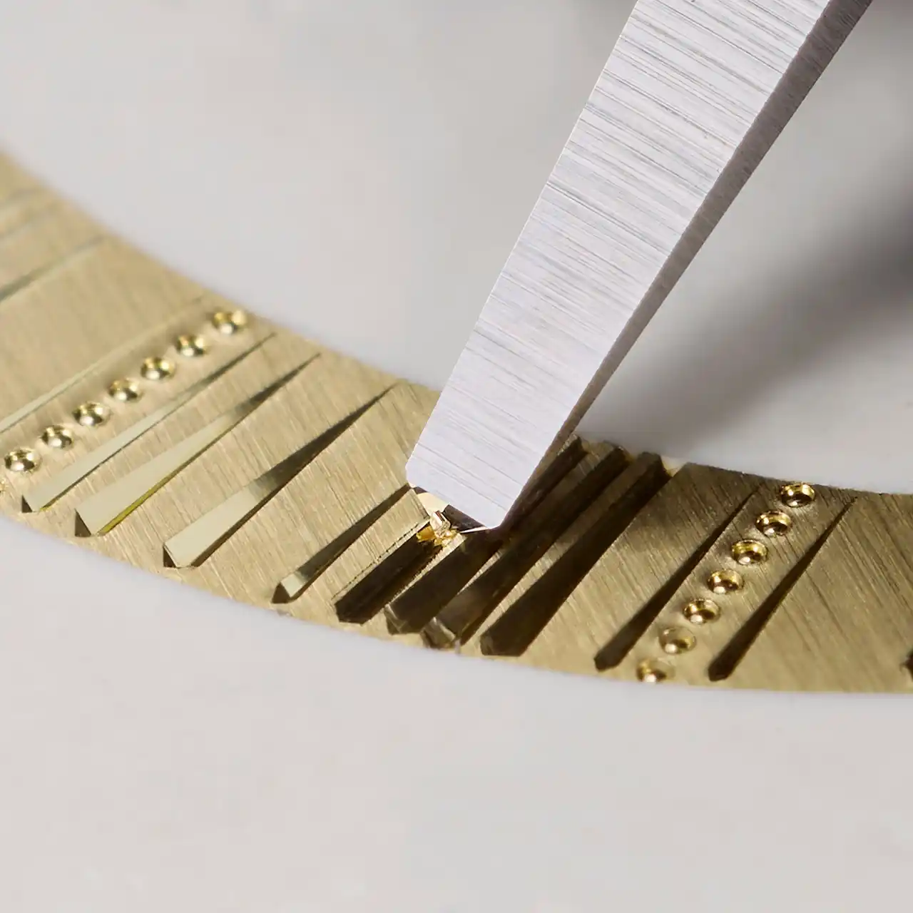 | 二層に重ねたダイヤルは、羽毛のように柔らかく細やかな模様を放射状に彫ることで、滑らかで絹のような質感と、光がたゆたうかのような優雅さを生み出しています。それぞれのダイヤルに繊細な彫金を施し、2層に重ねたとき、直線が途切れることなくつながるように仕上げるには、卓越した匠の技が求められます。 | ||||||||||||||||||||
