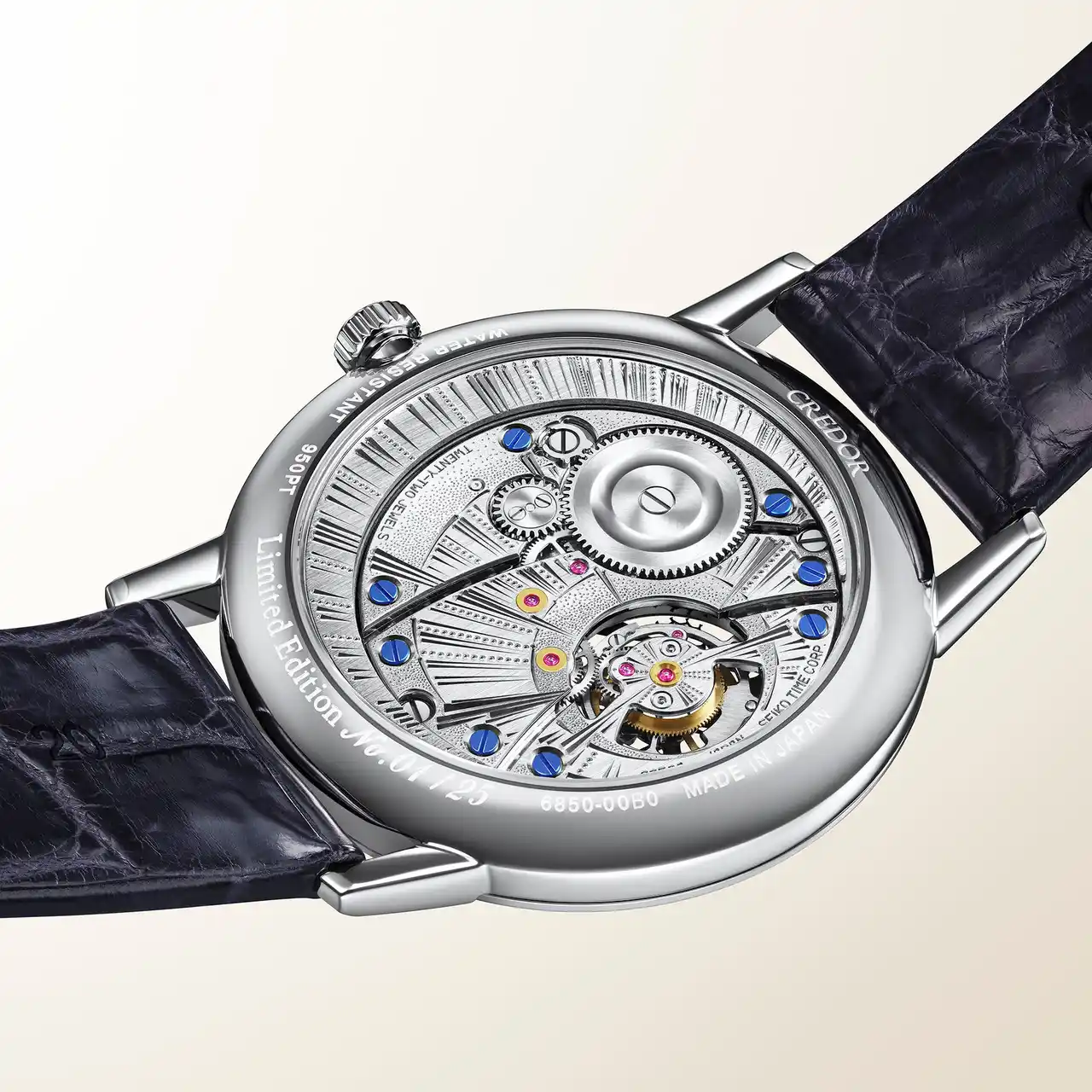 | さらに、彫金を施すパーツには、ベースの細やかな仕上げに加え直線だけでなく、連続した細かな円を刻む「魚々子(ななこ)」模様や、鏨(たがね)を使って付ける「六角荒らし」が施されています。これまでクレドールの彫金師が培った技を随所に活かした躍動感のある姿を、シースルーの裏ぶた越しに鑑賞することができます。 | ||||||||||||||||||||