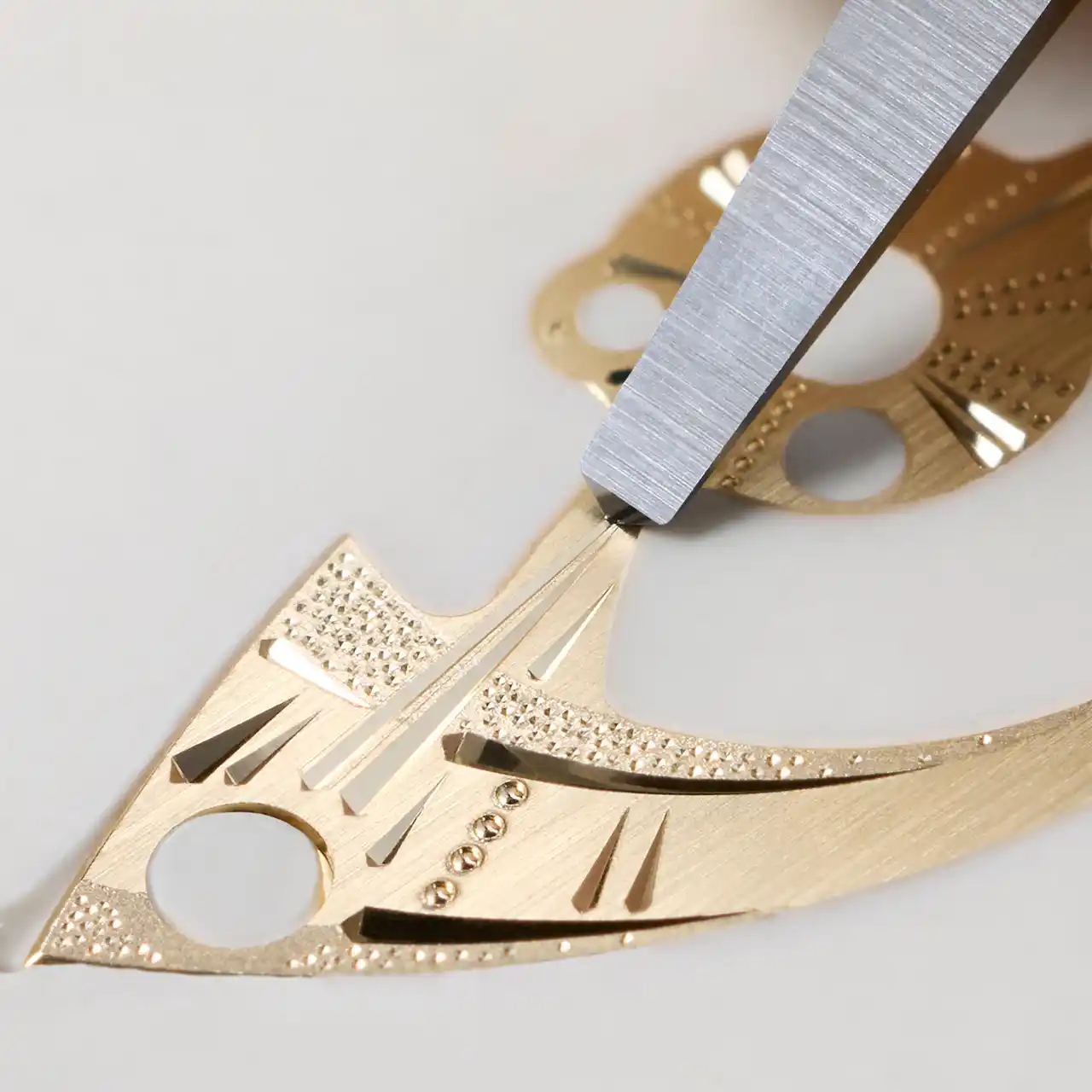 | この彫金技法は1996年に確立され、2026年は30年目を迎えます。彫金師は、独自の彫刻刀のメンテナンスやそのための道具作りも行い、腕時計を彩るために様々なアプローチを試しながら新しい表現を探求し続けてきました。 | ||||||||||||||||||||