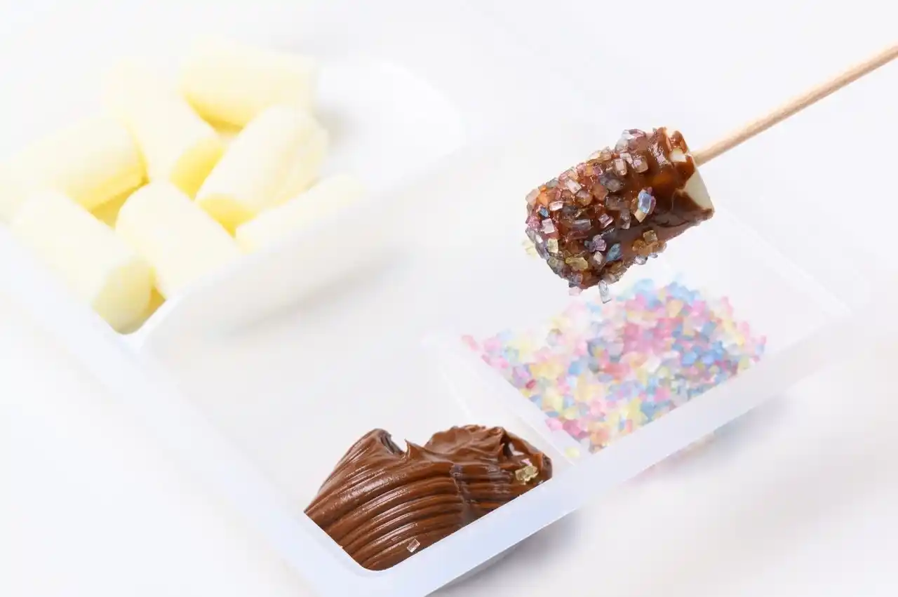 屋台で人気のチョコバナナのようなお菓子が作れる、2ステップで超かんたんな手作りお菓子。 |