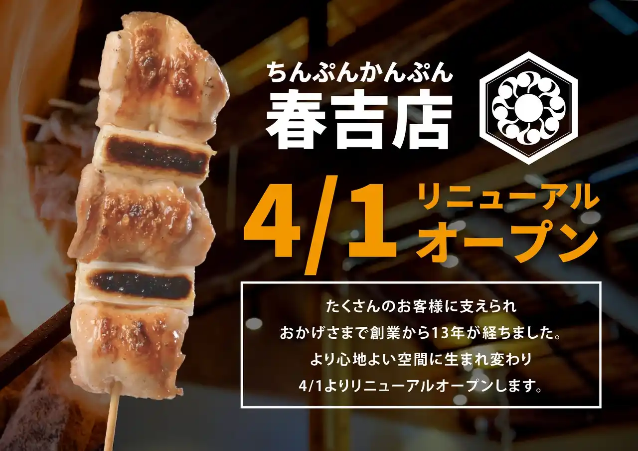株式会社WOF(本社:福岡市博多区/代表取締役:伊藤 亮輔)は、2026年4月1日に『ちんぷんかんぷん春吉店』をリニューアルオープンいたします。 |