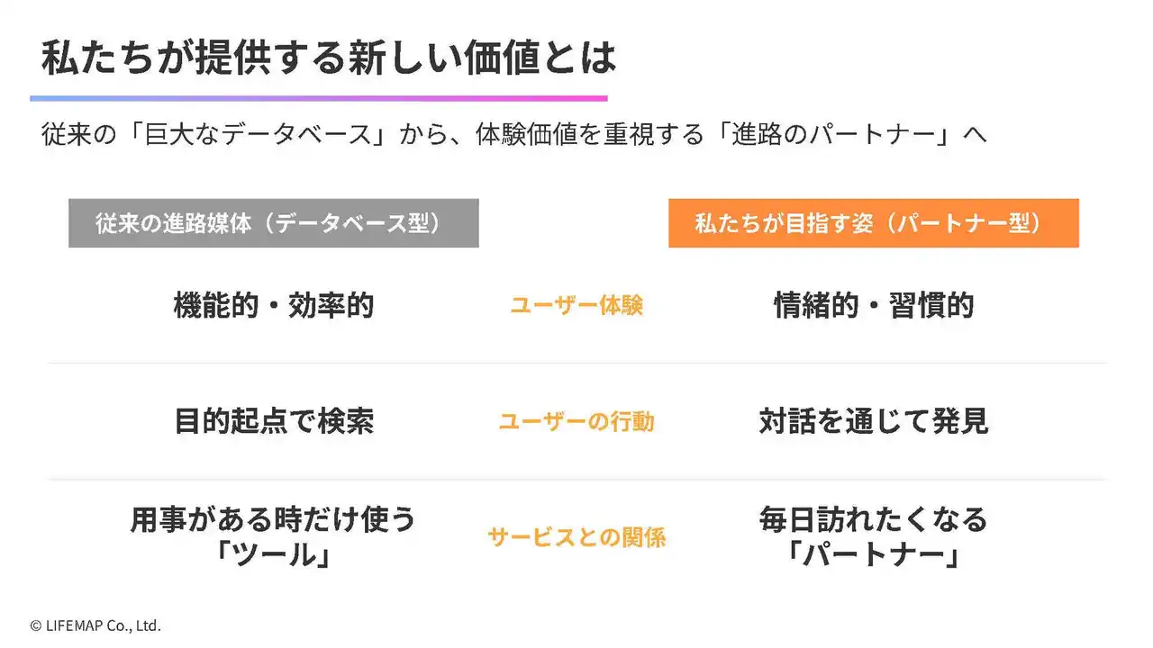 こうした課題に対し、「コレカラ進路.JP」は従来の「検索型」から「伴走型」への転換を図ります。コンセプトは、不安な“個”の進路探しを肯定し、未来への一歩に変える「進路のパートナー」です。 |