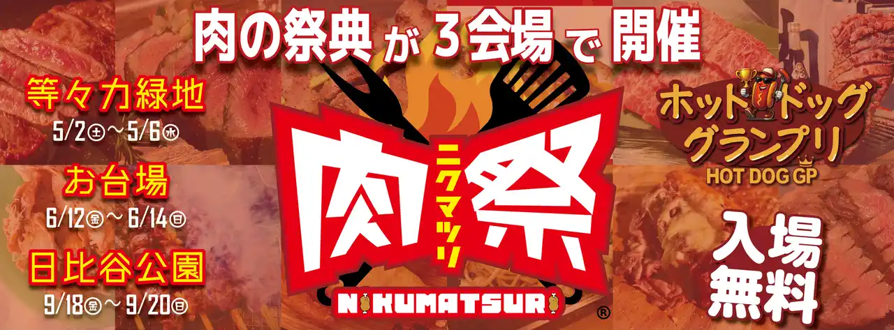 「肉祭2026」の第1弾はGWに開催!2026年5月2(土)~6日(水・祝)<5日間>、神奈川県川崎市中原区「等々力緑地~催し物広場~」にて、『肉祭2026in等々力緑地』 を開催いたします。 |