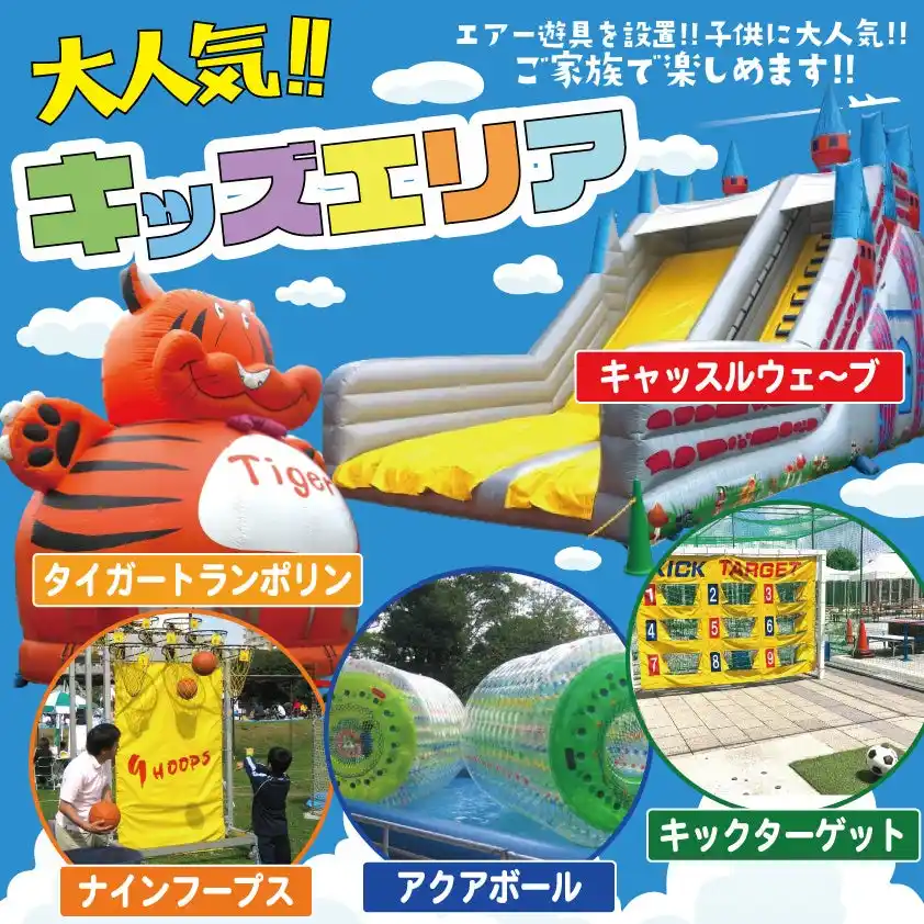 トランポリンやスライダー、アクアボールの「ふわふわ遊具」や、ゲームセンターや射的などの縁日。バスケットフリースローや、サッカーストラックアウトなど、"楽しめるコンテンツ”もご用意しております!! |