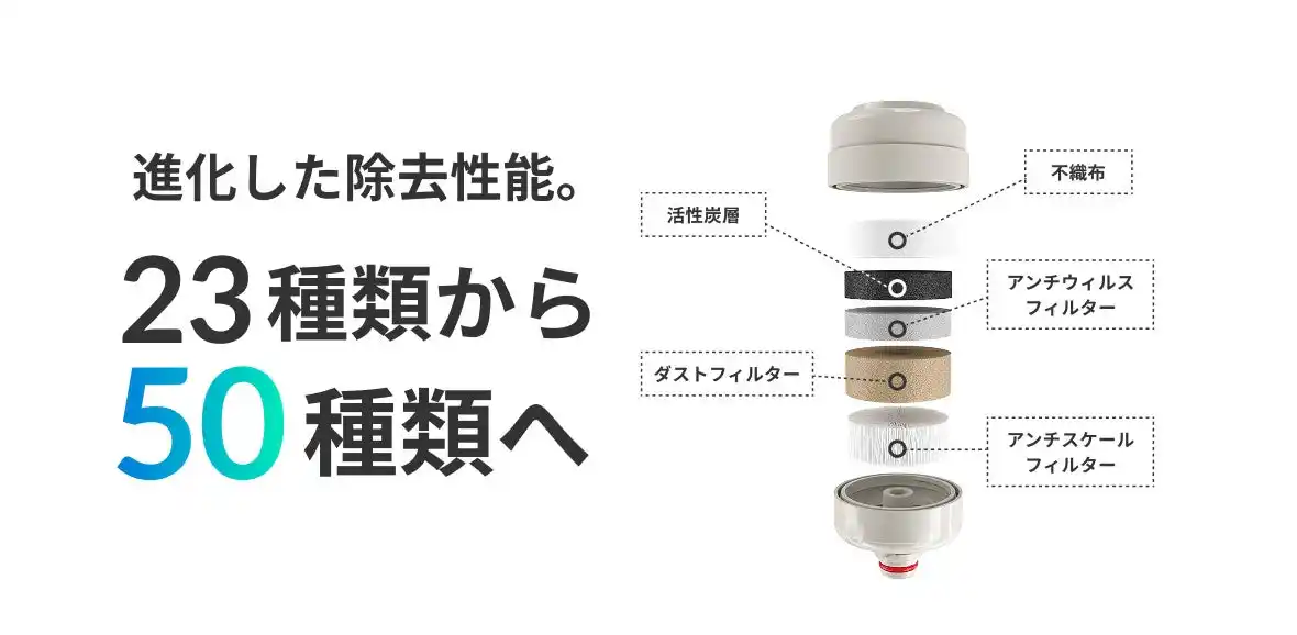 ・50種類の不純物を除去(有害物質40種類+細菌8種類+ウイルス2種類) |