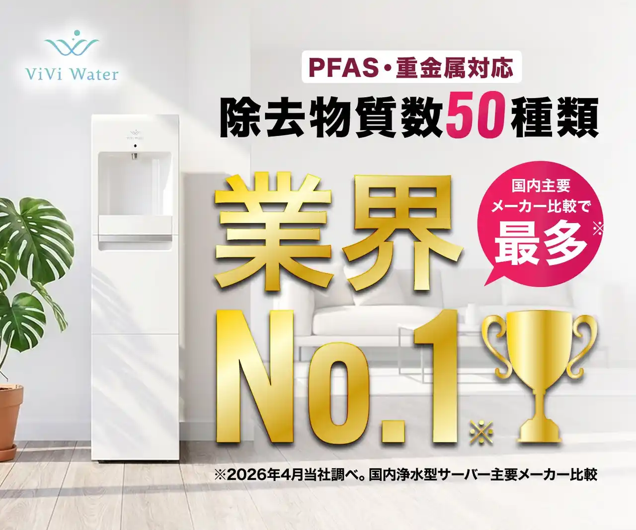 株式会社VISION(本社:愛知県名古屋市中区栄、代表取締役社長 鈴木浩司)は、「本当に安心して飲める水」をすべてのご家庭にお届けするため、当社の浄水型ウォーターサーバー「ViVi Water」において、有害物質40種類+細菌8種類+ウイルス2種類=合計50種類の除去を実現した新浄水カートリッジ「ハイグレードプラス」を、2026年4月1日(水)より全機種に標準搭載して提供開始いたします。 |