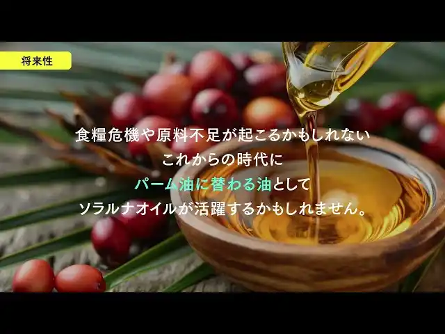 また、ソラルナ(R)オイルはパーム油に組成が類似していることから化粧品原料、食品原料として活用するための研究開発をおこない、国内での培養、原料化を進めていきます。