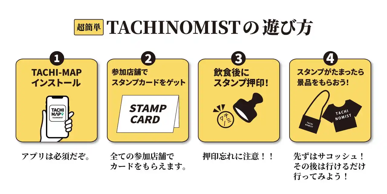 専用アプリ「TACHI-MAP」を使えば、参加店舗の営業時間や現在営業中の店舗をリアルタイムで確認可能。次に行く店を迷わず選べます。 |