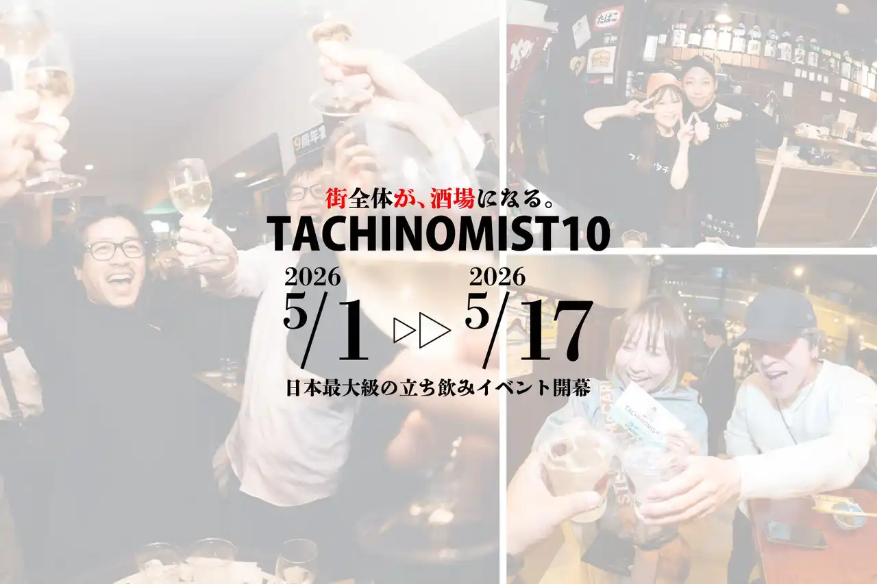株式会社Thinkingfor(本社:福岡県福岡市、代表取締役社長:落水研仁)は、2026年5月1日(金)から5月17日(日)まで、福岡市内を舞台とした立ち飲みはしご酒イベント『TACHINOMIST10(タチノミスト)』を開催いたします。 |