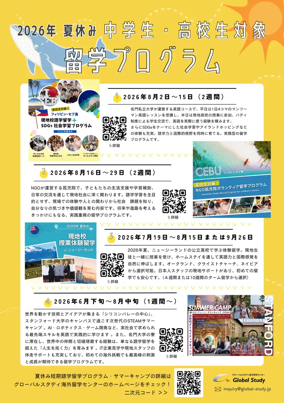 Zenken株式会社(本社:東京都港区、代表取締役社長:林 順之亮、以下 Zenken)が運営するグローバルスタディ海外留学センターは、中学生・高校生を対象とした「2026年夏休み短期留学プログラム」のオンライン説明会を開催いたします。 |
